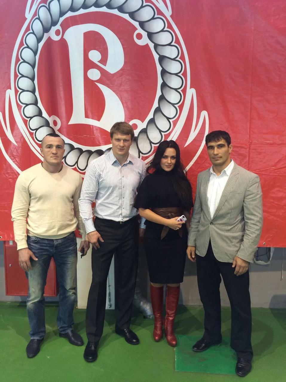 Спорт — это сила, мужественность, несокрушимый характер! На фото — боксеры-профессионалы Денис Лебедев и Александр Поветкин (слева от героини), заслуженный мастер спорта по самбо нижегородец Раис Рахматуллин (справа).