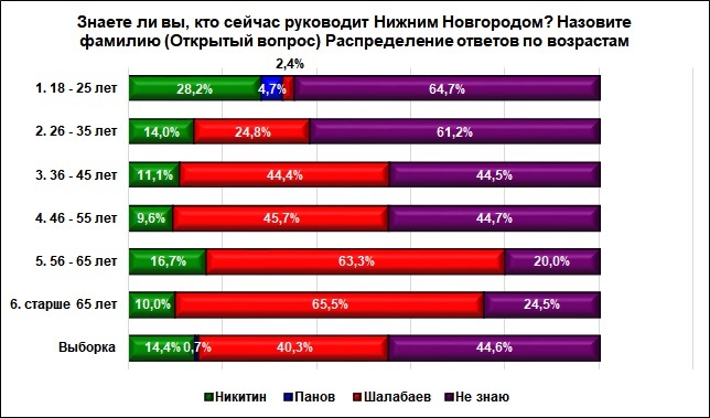 Но большинство опрошенных — 44,6% — затруднились назвать какую-либо фамилию.14,4% считают, что Нижним Новгородом руководит губернатор Глеб Никитин, а 0,7% полагают, что главой города является Владимир Панов.