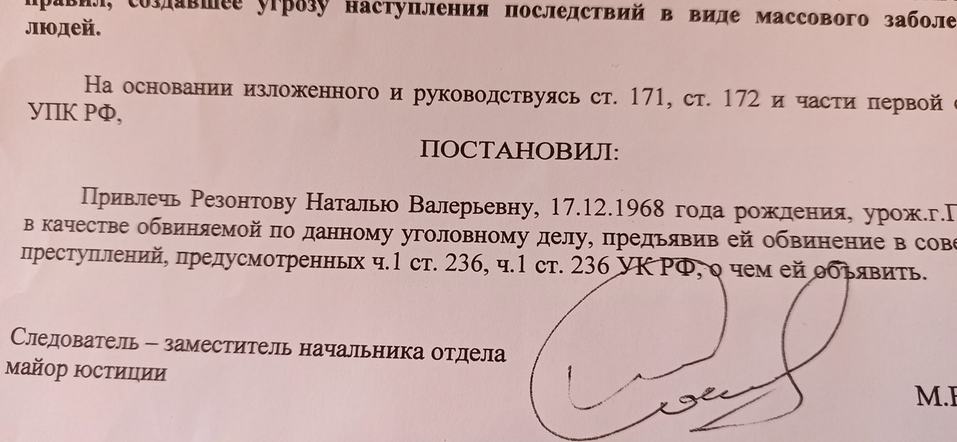 Ее обвинили по ч. 1 ст. 236 УК РФ («Нарушение санитарно-эпидемиологических правил, повлекшее по неосторожности массовое заболевание или отравление людей либо создавшее угрозу наступления таких последствий»). Постановление журналистка также опубликовала в соцсетях.