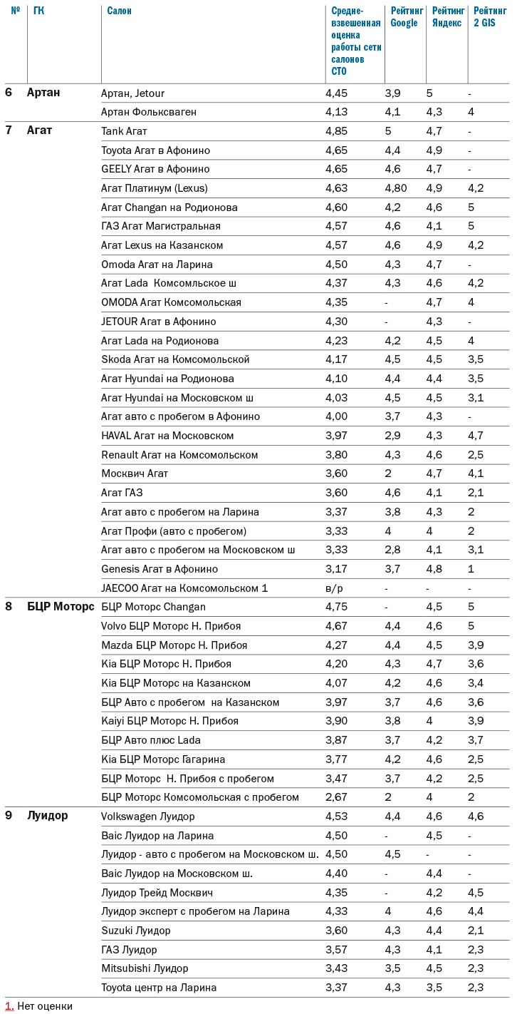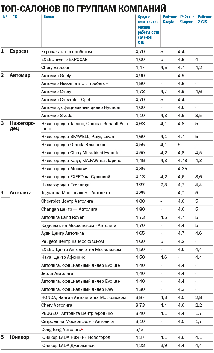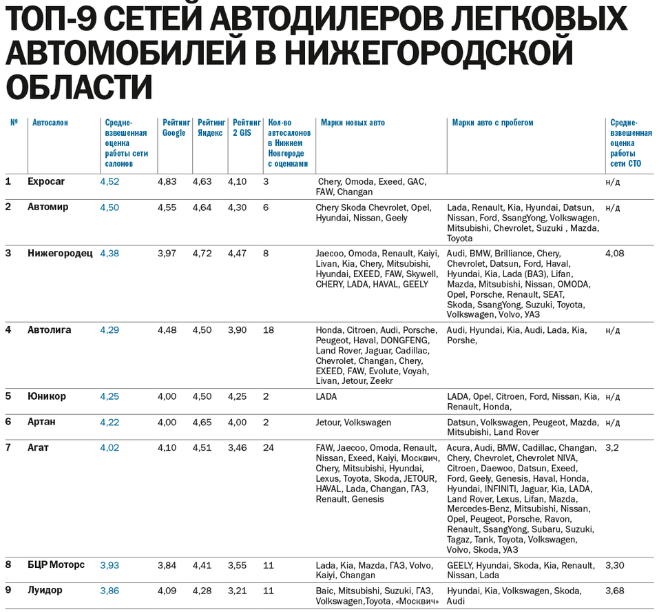 Основной ранжирующий показатель — средний балл по оценке всех автосалонов сети, у которых проставлены оценки на платформах веб карт, баллы округлены до сотых после запятой.